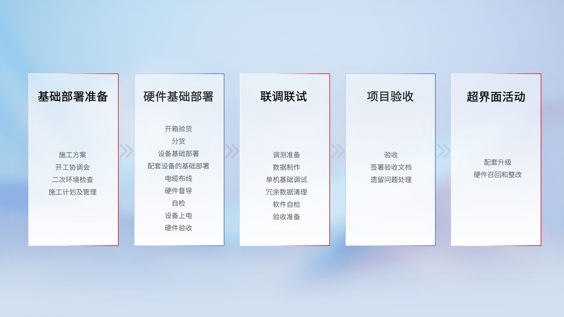 从基础部署准备、、硬件基础部署、、、联调联试、、、项目验收、、越界面活动的全过程可追溯,,,,保证施工质量和进度。。。
